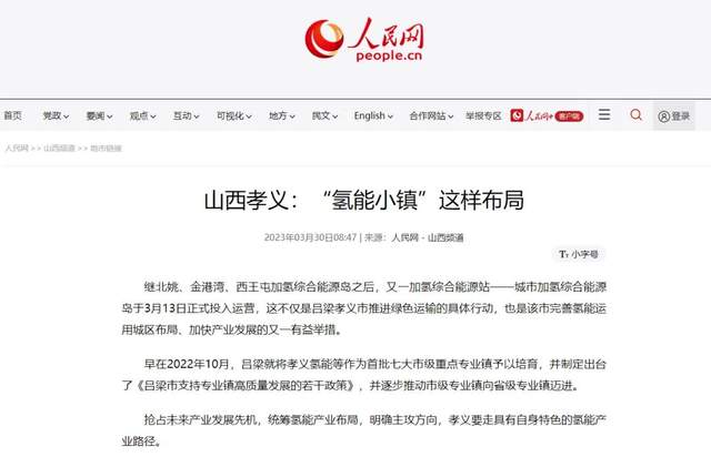 3月30日,人民网-山西频道发布文章《山西孝义:“氢能小镇”这样布局》,以im电竞电子竞技平台制、储、运、加、用、装备制造等氢能全产业链布局进展为切入点,全方位报道了孝义市谋划布局的“氢进万家·氢能小镇”科技示范工程。